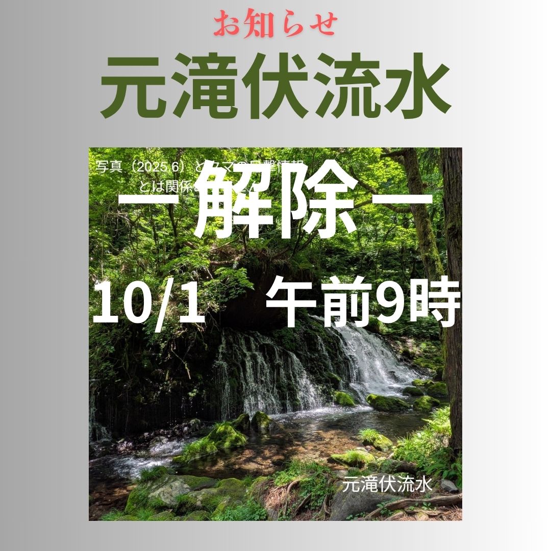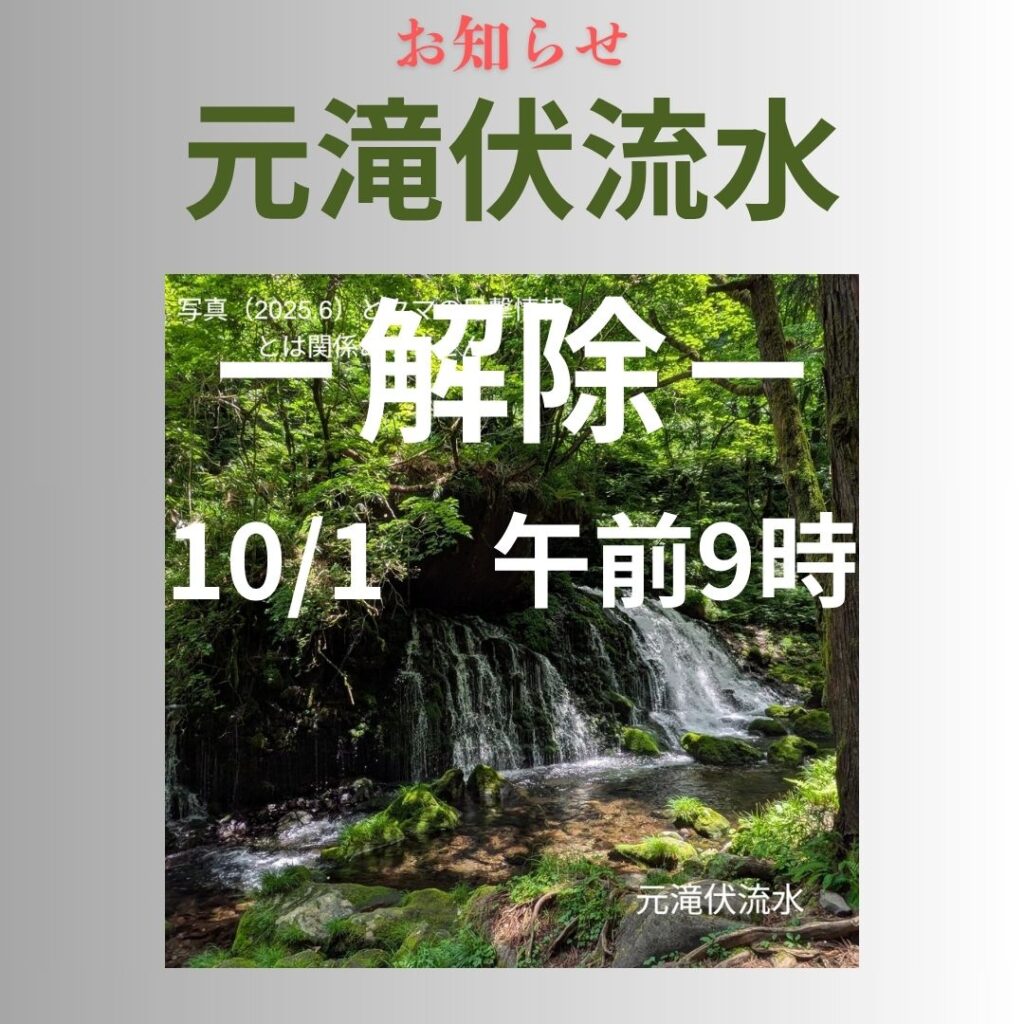 <解除のお知らせ>元滝伏流水10/1(水)午前9時に解除となります!付近でクマが目撃され(9/27)、それにともない元滝伏流水は封鎖されておりましたが明日10月1日(水)午前9時で解除が決まりましたのでお知らせします。今後も熊鈴つけるなど対策し周辺には十分ご注意してください!! 写真:2025.6元滝伏流水
