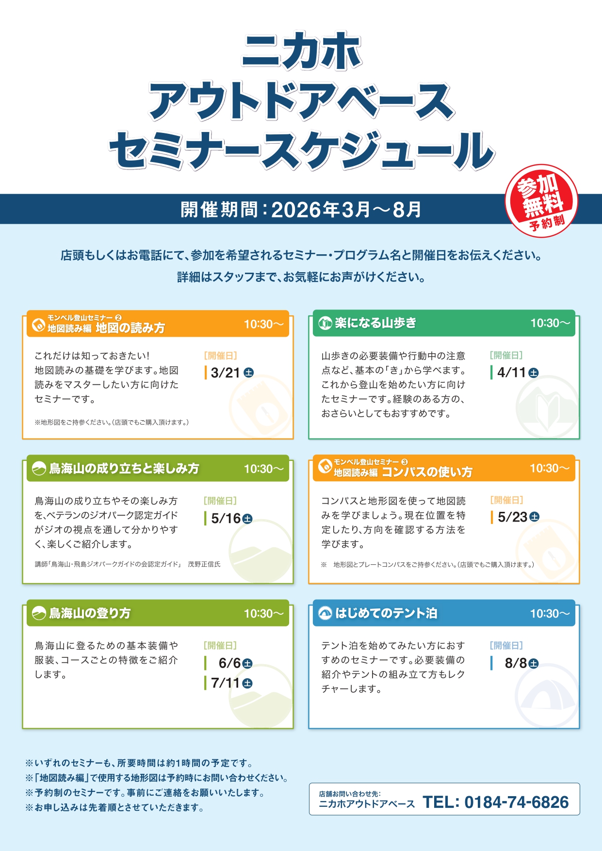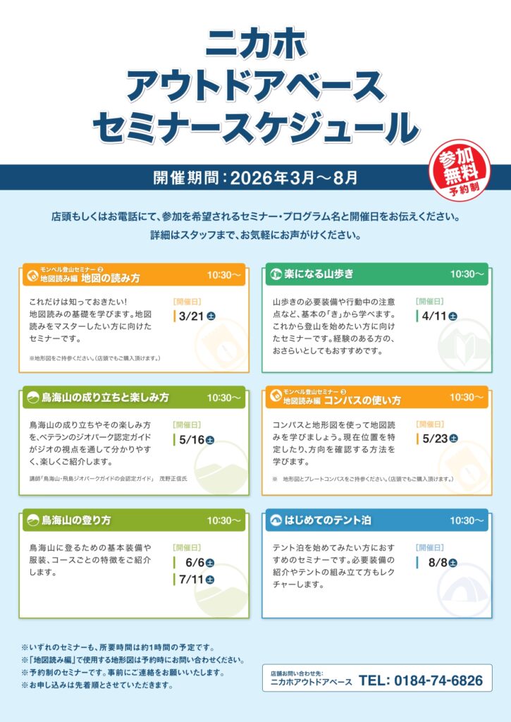 セミナースケジュール(2026.3月~8月) 予約制、事前のお申込み(先着順)となります。(所要時間1時間程度)♦開催日:令和8年3月~8月♦時間:AM10:30~♦場所:ニカホアウトドアベース(モンベルにかほ店)※詳細はチラシをご覧ください ■ お問い合わせ ニカホアウトドアベース(10:00~19:00)電話番号:0184-74-6826