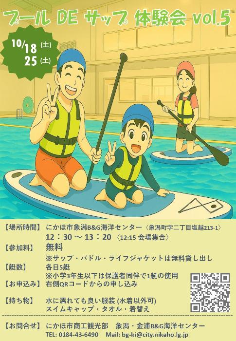 プールDEサップ 体験会 vol.5今話題の水上アクティビティ「サップ」を安全なプールの上で体験できます。初心者大歓迎!ご家族やご友人の方も誘って是非ご参加ください!期日:10/18(土)・10/25(土)時間:12:30~13:20場所にかほ市象潟B&G海洋センター参加料:無料詳細はチラシをご覧ください申し込みはQRコードからお問い合わせ電話0184-43-6490