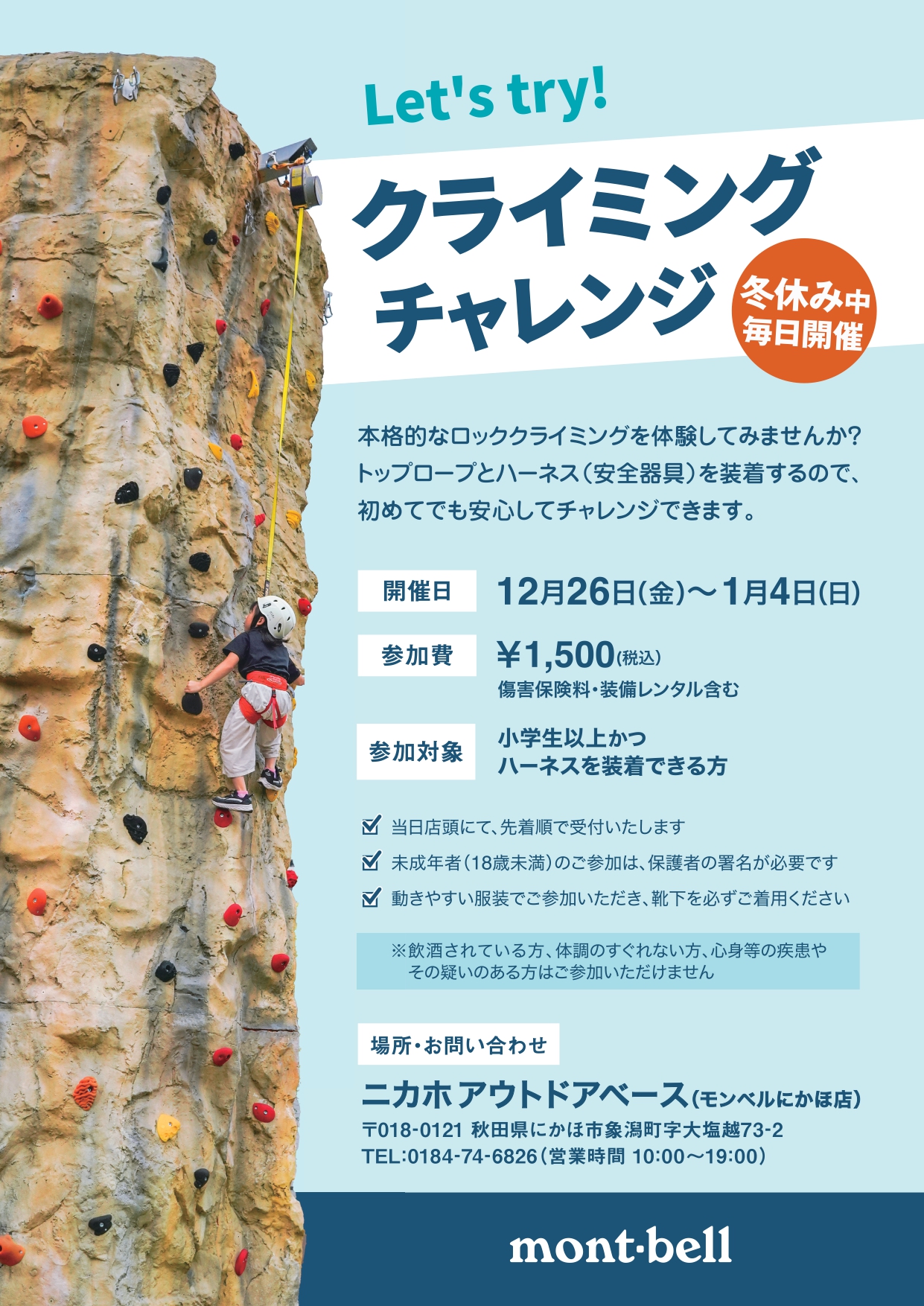 二カホアウトドアベースの「クライミングチャレンジ」は普段土日祝のみ開催していますが、次の期間は毎日開催します!この機会に是非、チャレンジしてみてください!【対象期間】令和7年12月26日~令和8年1月4日対象期間中にチャレンジした方に、「ねむの丘・はまなす」で使用できる入浴料50円割引券(1枚につき4名まで有効)をプレゼント🎁カラダを動かしたあとには温泉♨もご利用ください!