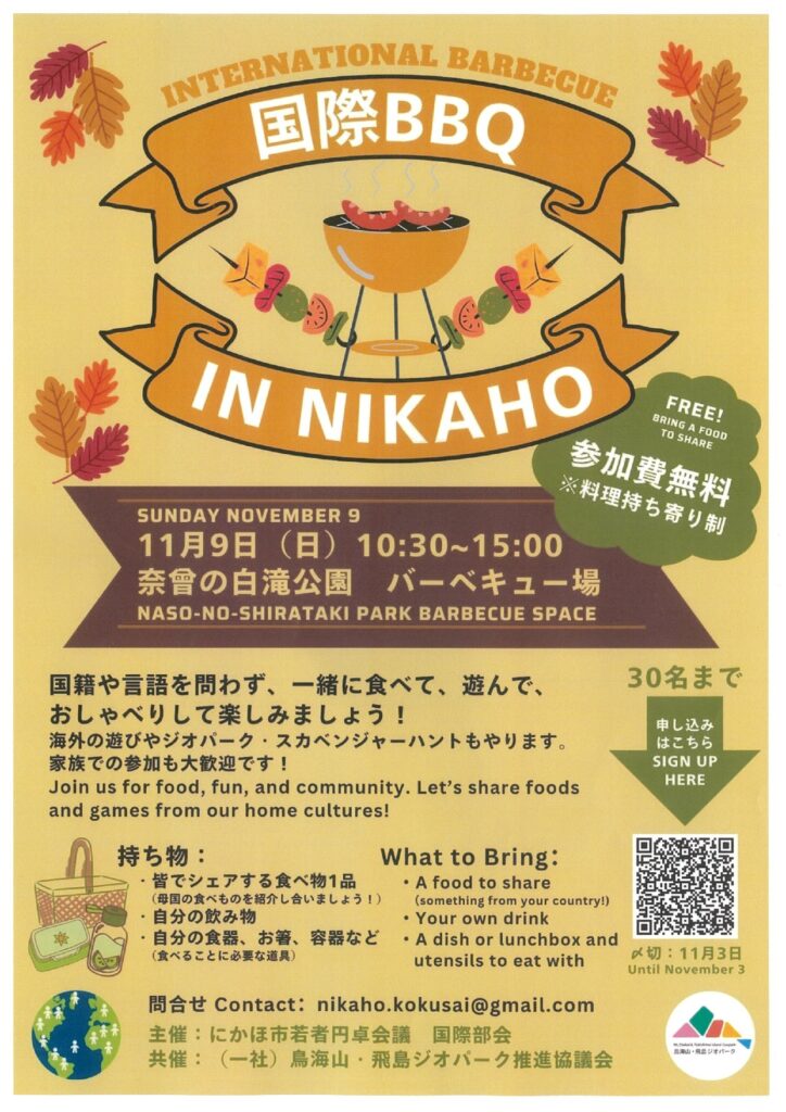 期日:11/9(SUN)時間:10:30~15:00参加:無料(30名)申込締切:11/3場所:奈曽の白滝公園/バーベキュー場持ち物:皆でシェアする食べ物1品自分の飲み物、自分の食器、箸、容器など問合せはチラシをご覧ください(e-mail)主催:にかほ市若者円卓会議 国際部会一緒に楽しみましょう👍😊