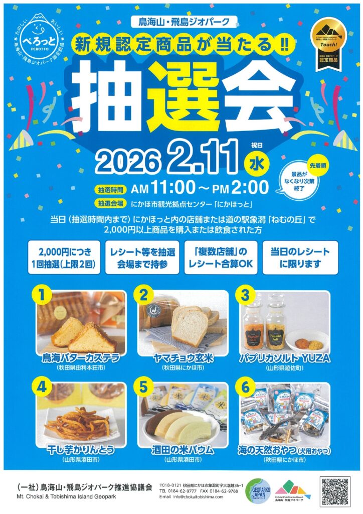 新規認定商品が当たる!!♦開催日:令和8年2月11日(水)♦時間:AM11:00~PM2:00♦抽選会場:にかほ市観光拠点センター「にかほっと」※詳細はチラシをご覧ください ■ お問い合わせ (一社)鳥海山・飛島ジオパーク推進協議会電話番号:0184-62-9777