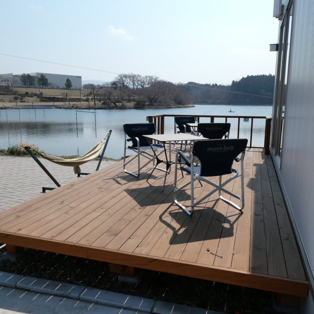 汗を流せるシャワー室、景色を楽しむウッドデッキ、