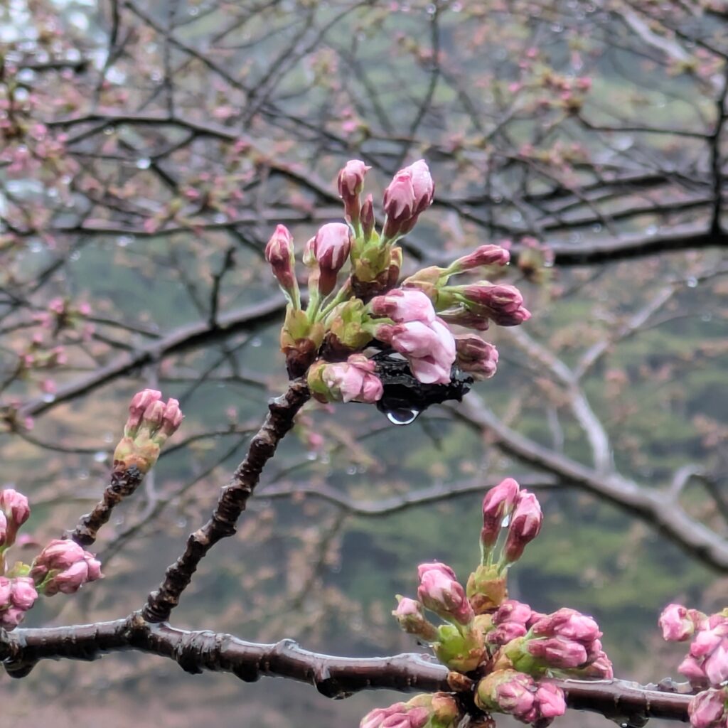 天気は雨、気温も低く終日7℃前後の予報で肌寒いですが、雨露しっとり濡れたつぼみも鮮やかです。