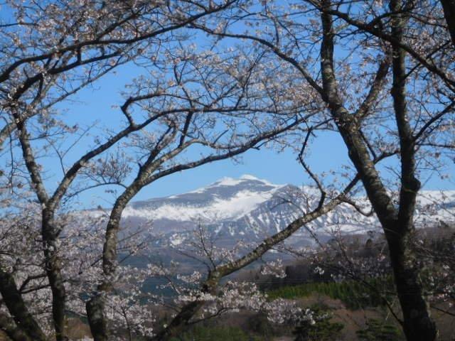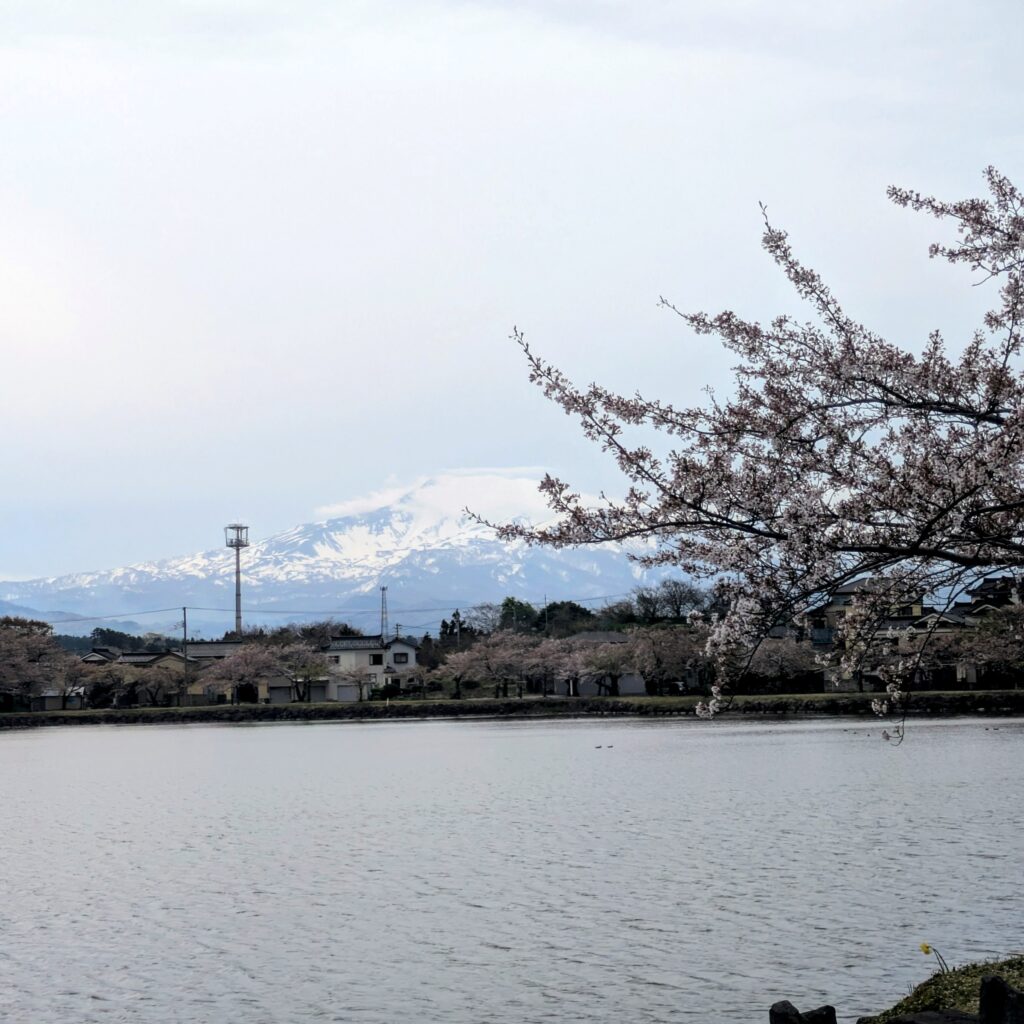 どんより曇り空で鳥海山は見えません、桜も散り始めています。