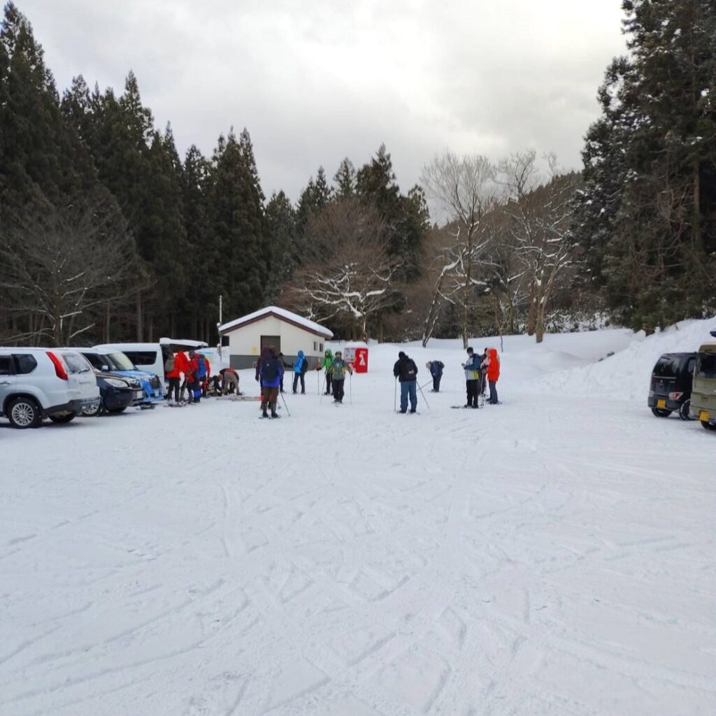 元滝伏流水駐車場へ各自移動しでスノーシューとストックの貸出し、